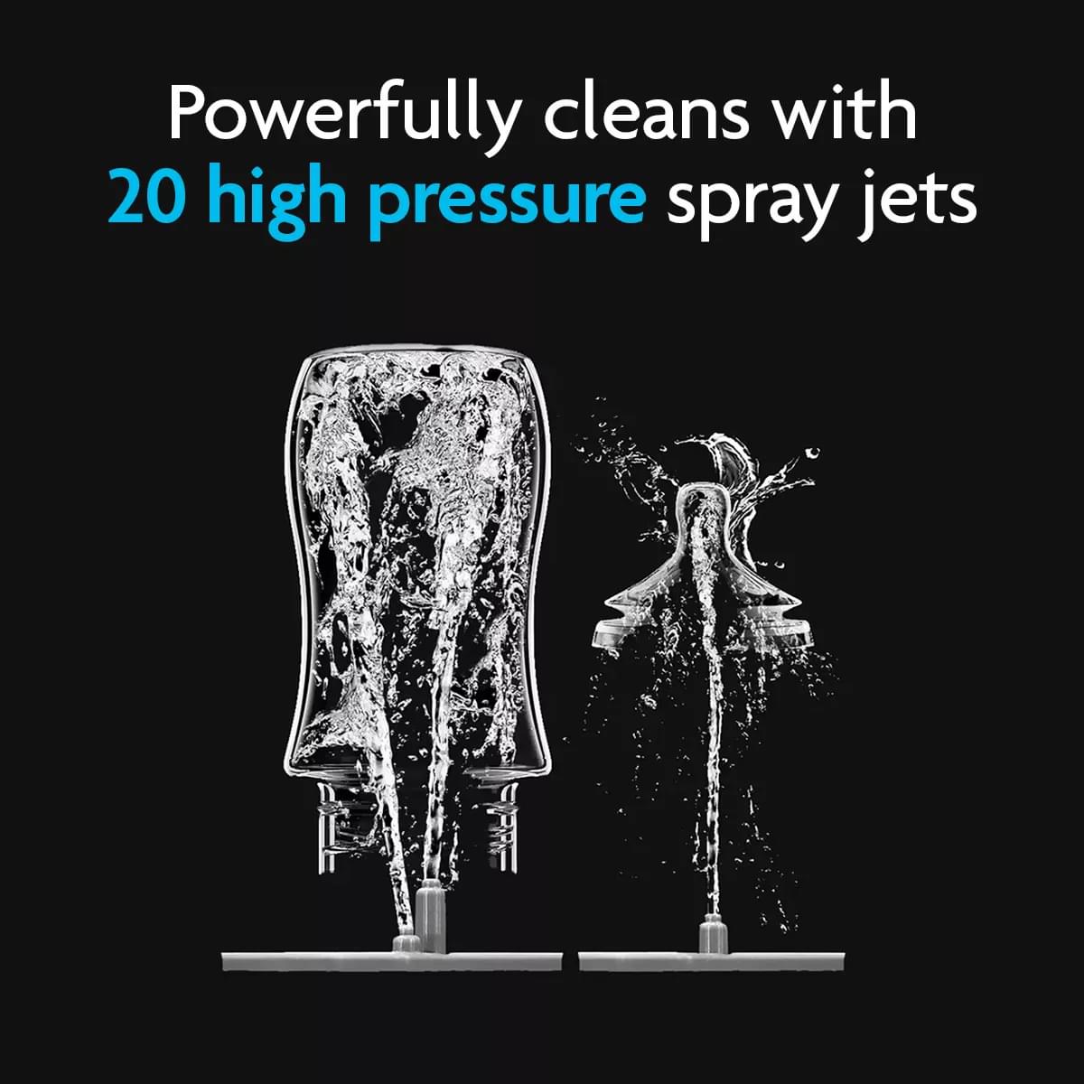- Automatically and powerfully cleans with its 20 high-pressure spray jets