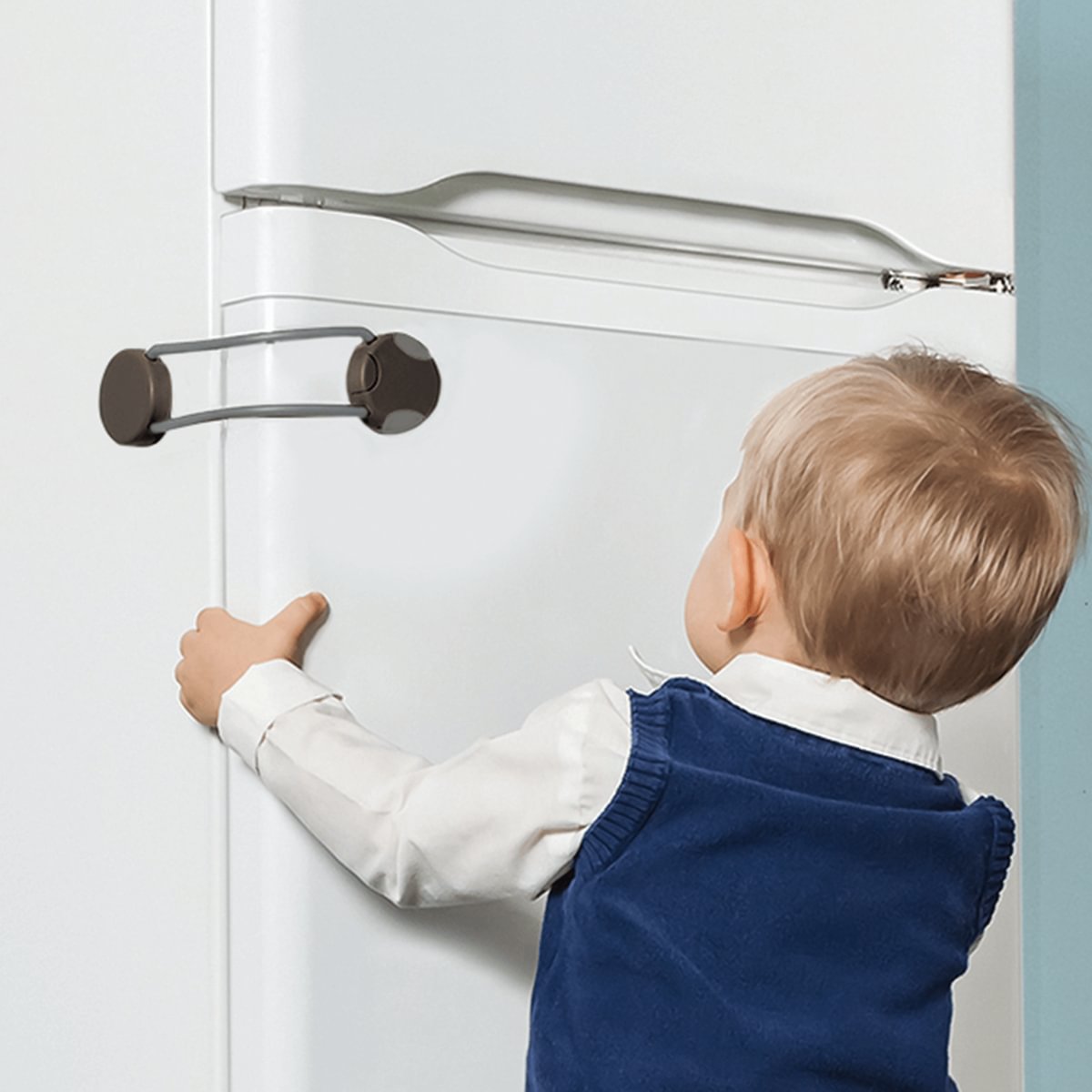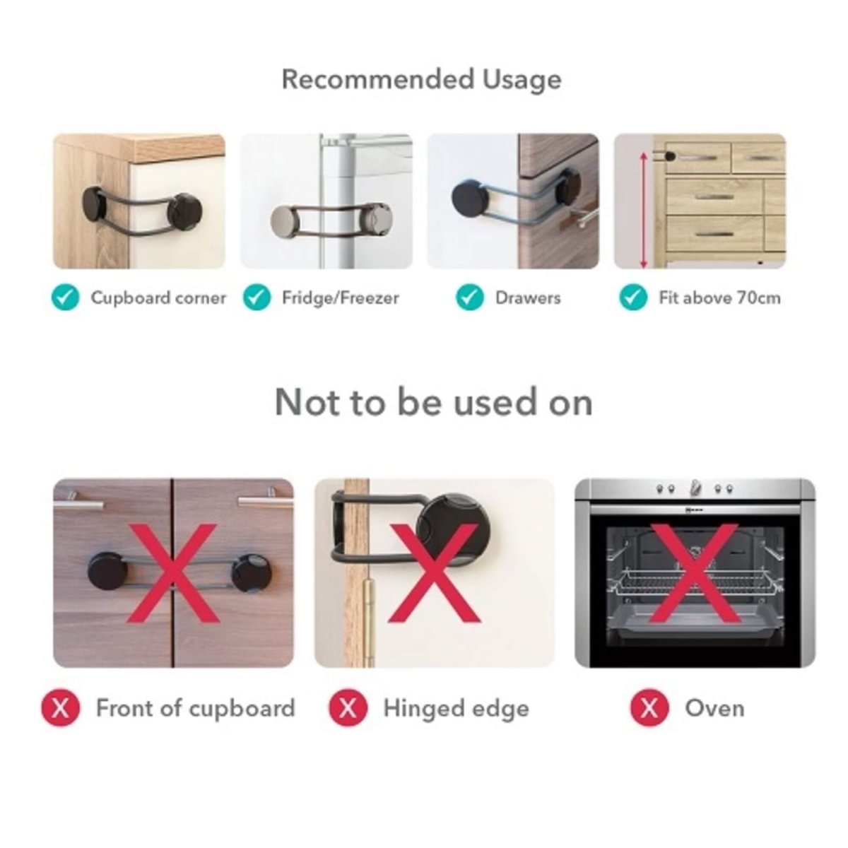 The Multi-Purpose Block fits on the side of a cabinet so the drawer or door will be unable to open, preventing little fingers from getting trapped. The block itself is impossible for children under 2 to open, yet possible for parents to open with one hand, keeping the locked cupboards and drawers easily accessible.