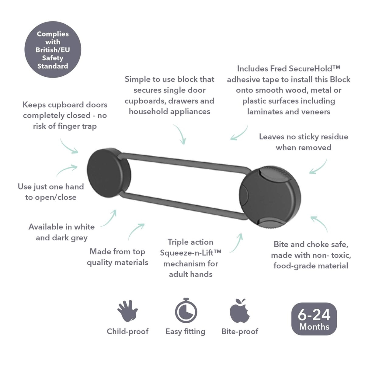 Baby proof your cupboards and household appliances with the Fred Home Safety Multi-Purpose Block, designed to securely lock single-sided cupboards and drawers. Featuring a triple action Squeeze-n-Lift™ mechanism that little ones cannot open.