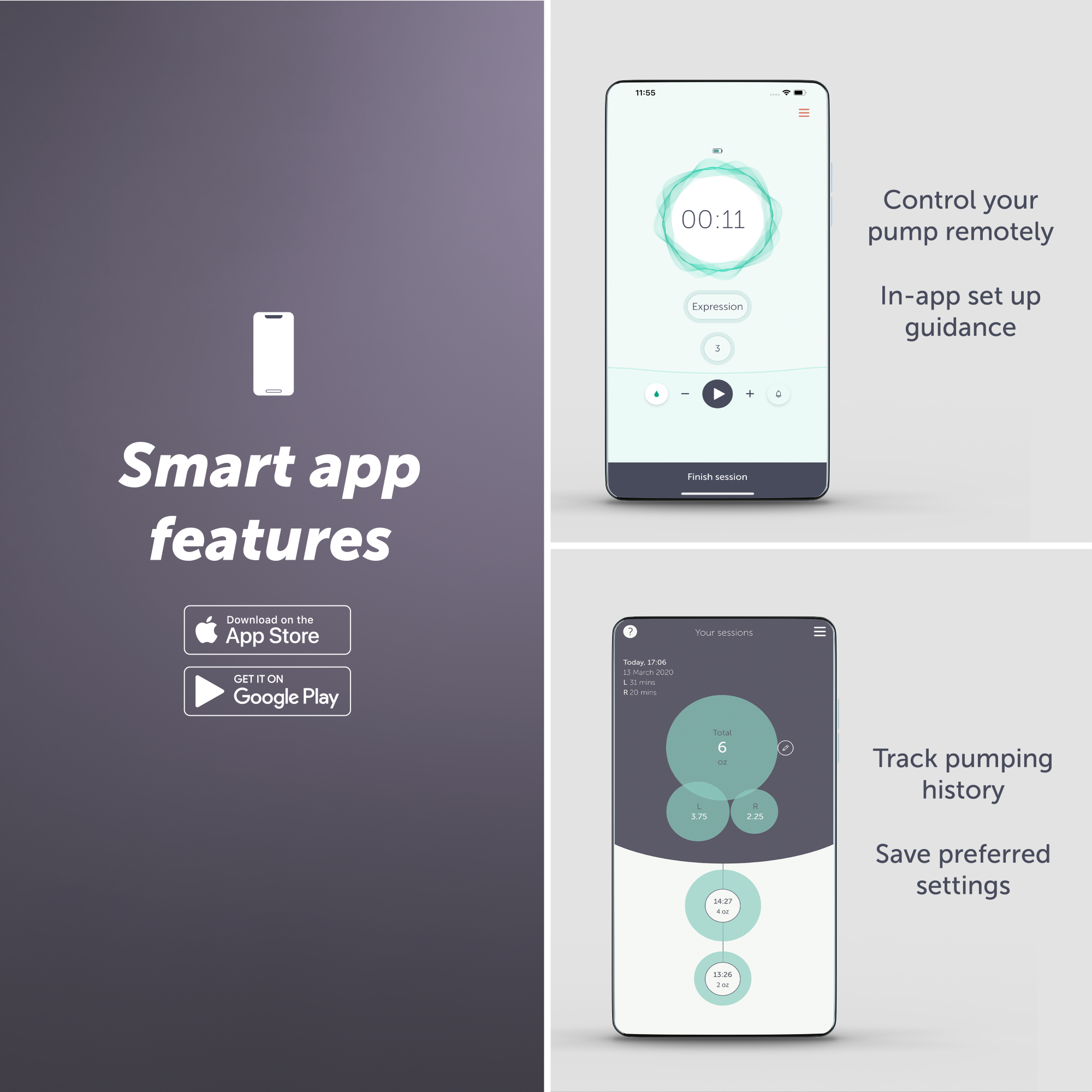 Puts you in control: Checking a text? Nuh-uh, just flexing on mobile pumping. With our specialised breastfeeding Pump with Elvie app, you can control your pump remotely, adjust intensity settings and keep tabs on your pumping history, all from your phone.