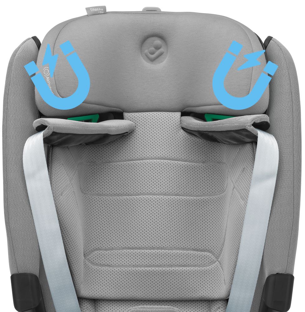 One car seat that makes everyday family travel easy - for years. Titan Pro i-Size is fitted quickly and effortlessly into any car, via ISOFIX installation and top-tether. The easy-in 5-point safety harness has some extra magic! The shoulder pads have invisible magnets that stick to the headrest, to keep the harness open and out of the seat. This makes getting your little one in and out of the car, feel like a breeze instead of a daily chore. And as your child grows, the headrest and harness are simple to adjust, so they’re sitting comfortably at every age. Travel made easy, day after day. Year after year.