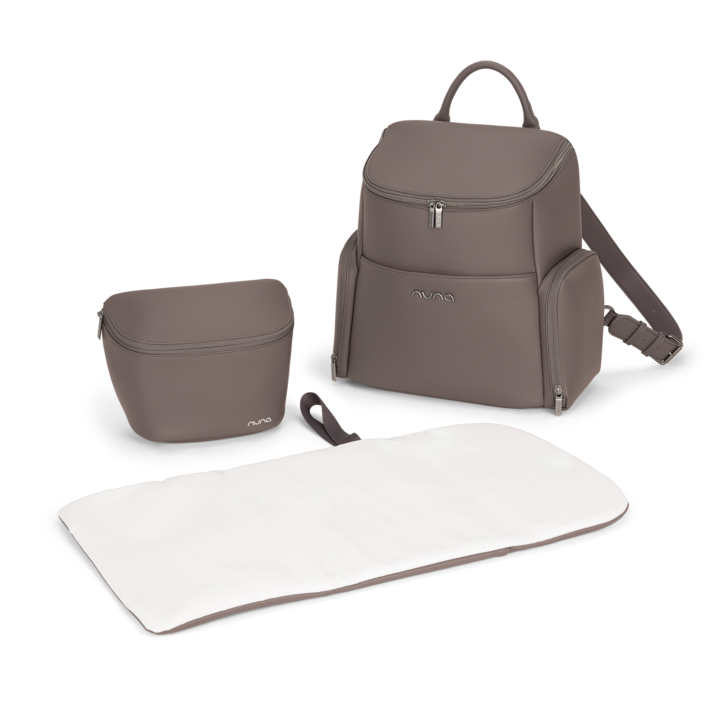 • Embroidered Nuna logo on toiletry pouch and changing pad clutch
