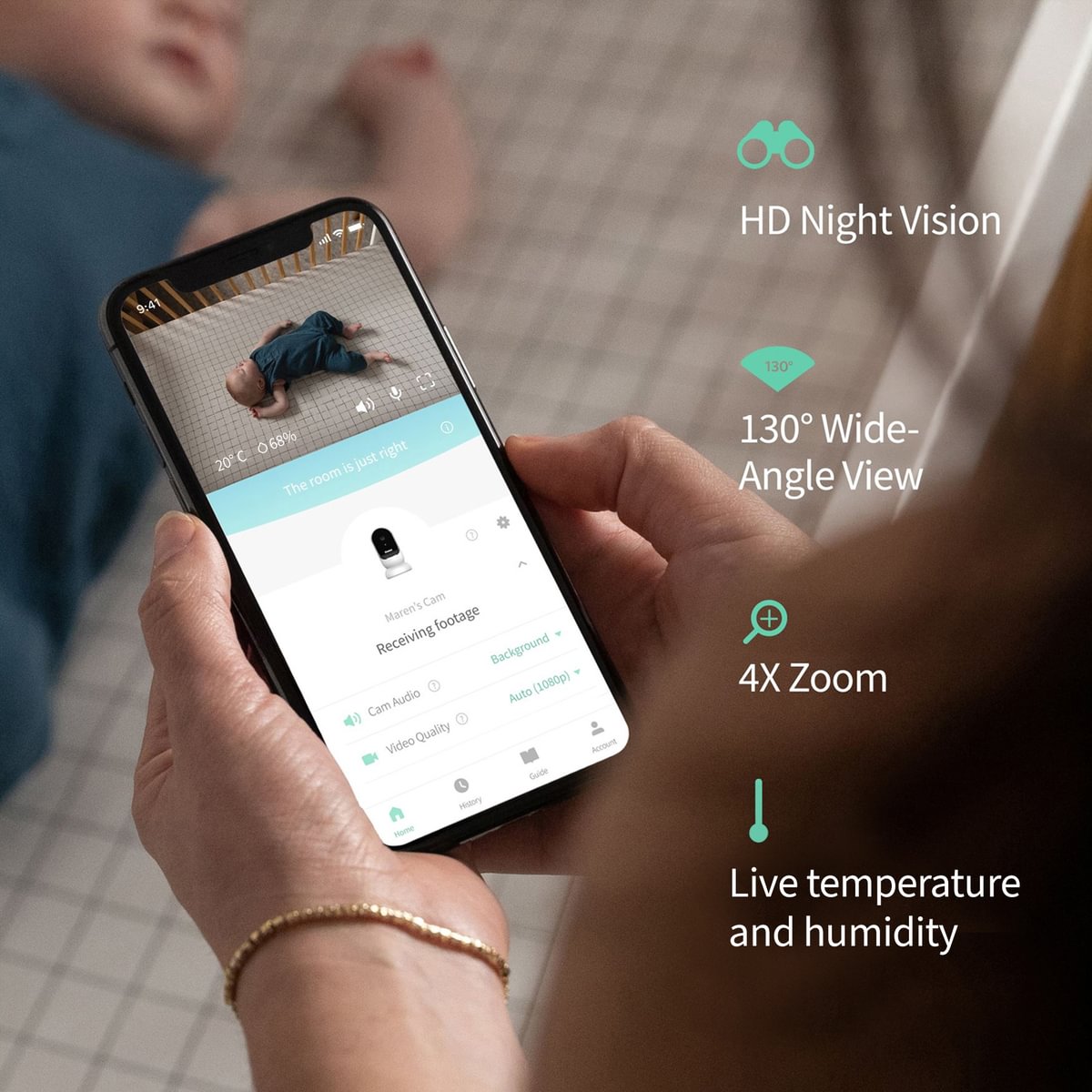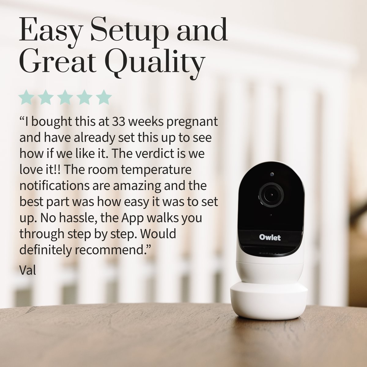 Use the free Owlet App to keep informed of your baby’s needs through regular motion, sound and cry notifications, room temperature and humidity sensor and background audio. Featuring high quality night vision, two-way talk audio, 130-degree wide-angle view and 4x digital zoom.