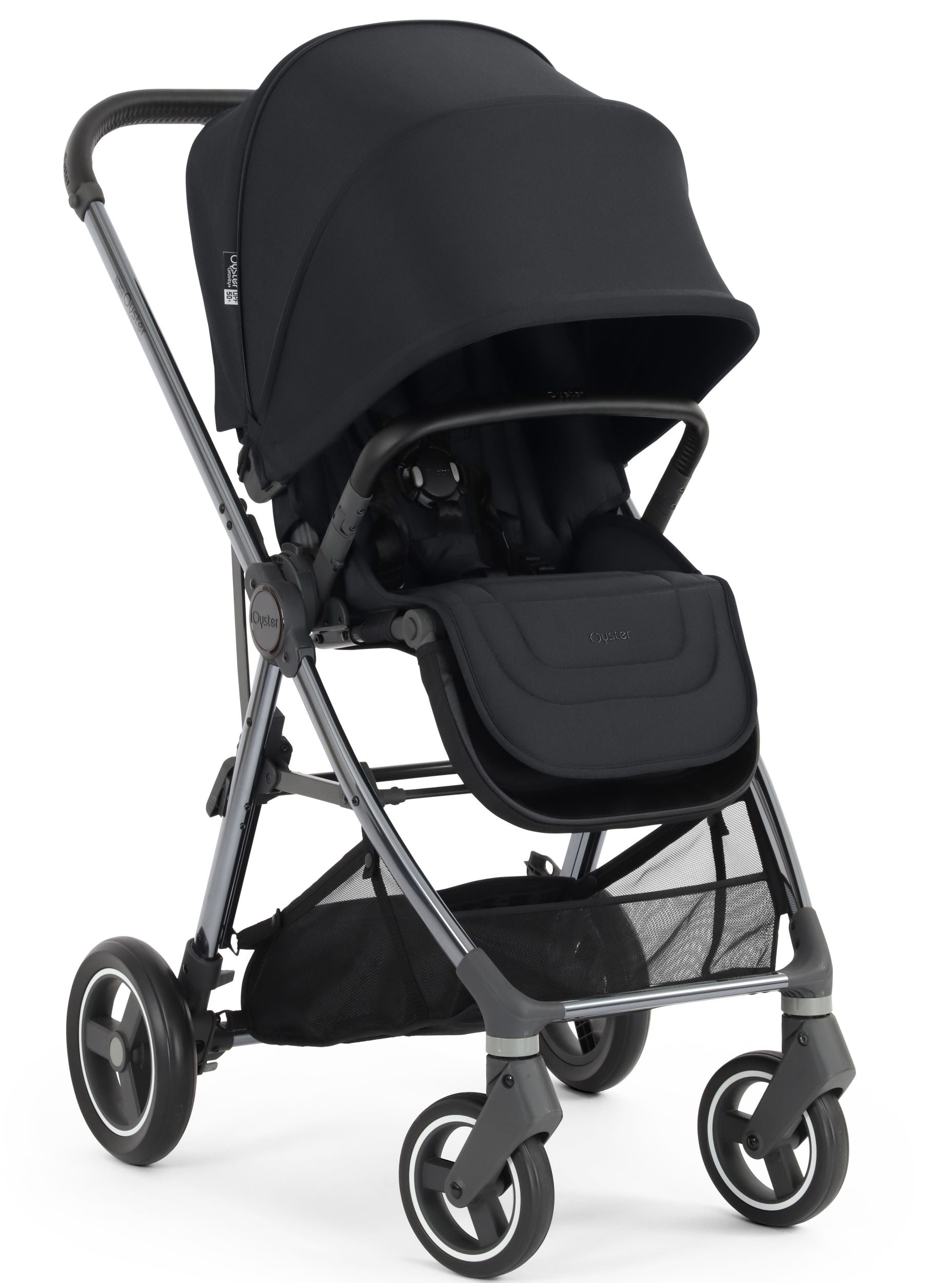 Stroller includes: chassis with wheels, complete seat unit, bumper bar and rain cover. Suitable from birth to 22kg. Compatible with the Oyster Carrycot.