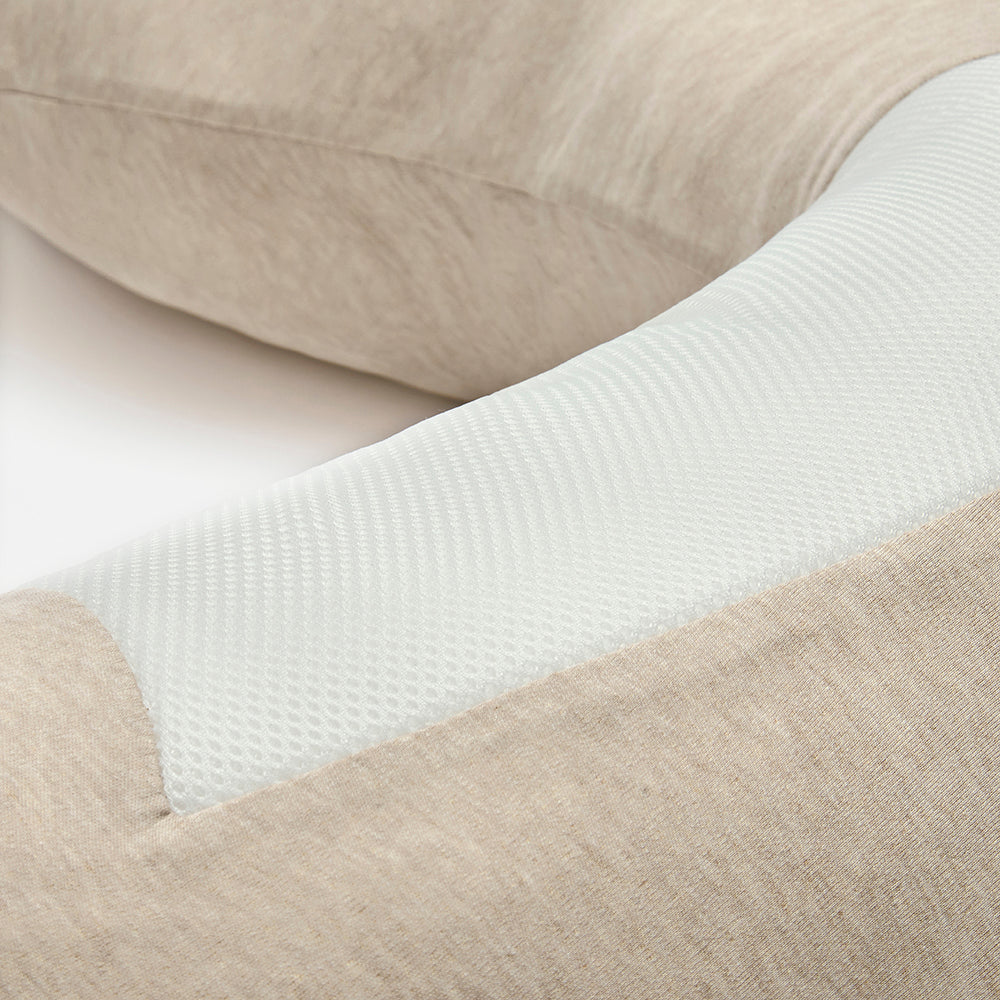 The Breathe Pregnancy Pillow features an ergonomic shape, designed to provide complete support and comfort for a more restful night’s sleep during pregnancy. The 3D spacer mesh provides full breathability around the bump area and has ultra soft jersey cotton interlock throughout.