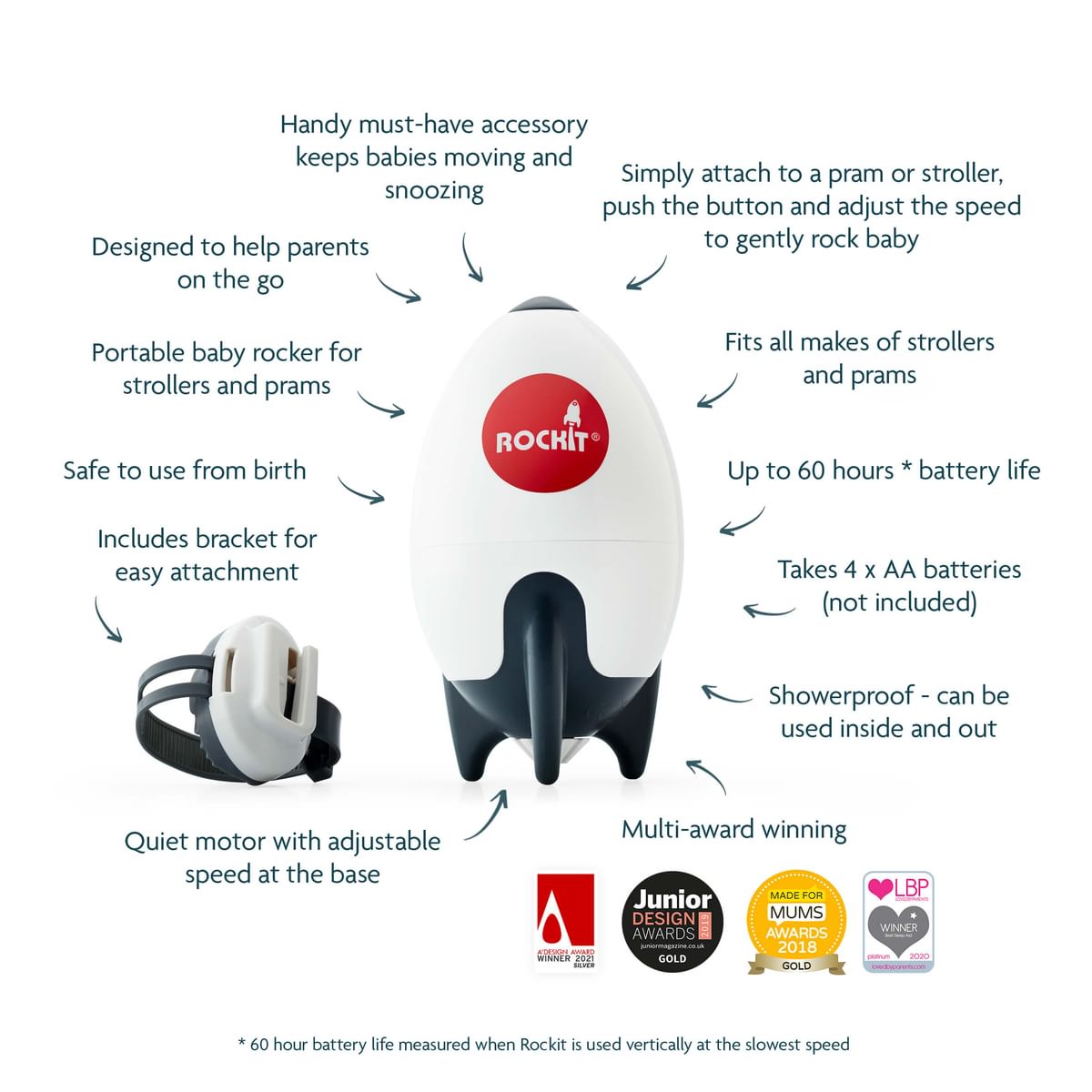 Does your little one wake up as soon as the buggy stops moving? The Rockit will keep rocking so you don’t have to! Created to help parents on the go, this handy must-have accessory keeps babies moving and snoozing. Simply attach to your pram or stroller, push the button and adjust the speed to gently rock your baby, just like you would with your hand.