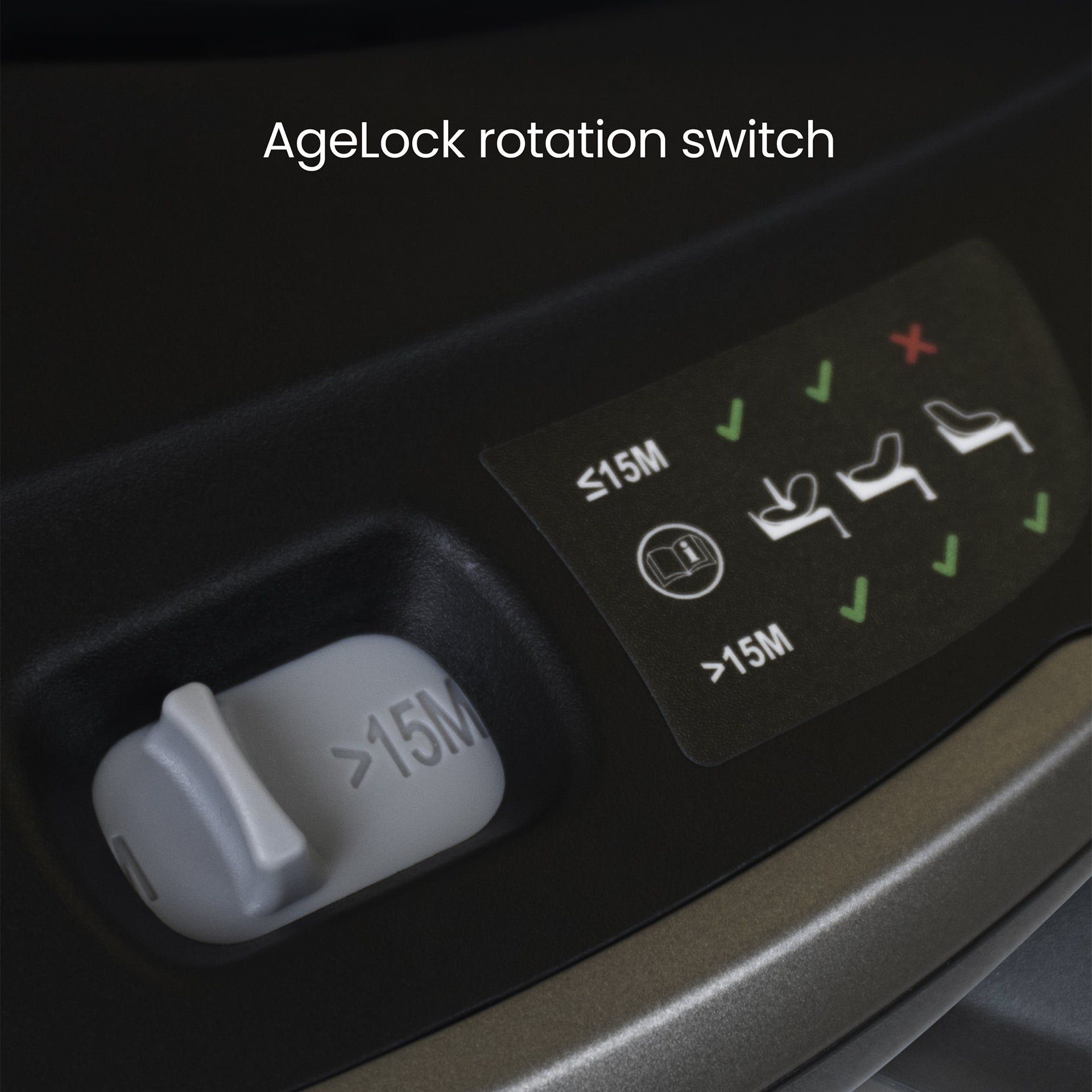 Ensures travel in the correct position: For added safety and peace of mind, the base’s AgeLock rotation switch helps ensure your child is always seated in the correct position. This switch locks the car seat securely into rear-facing or forward-facing mode, assuring confidence that your little one is travelling safely according to age.