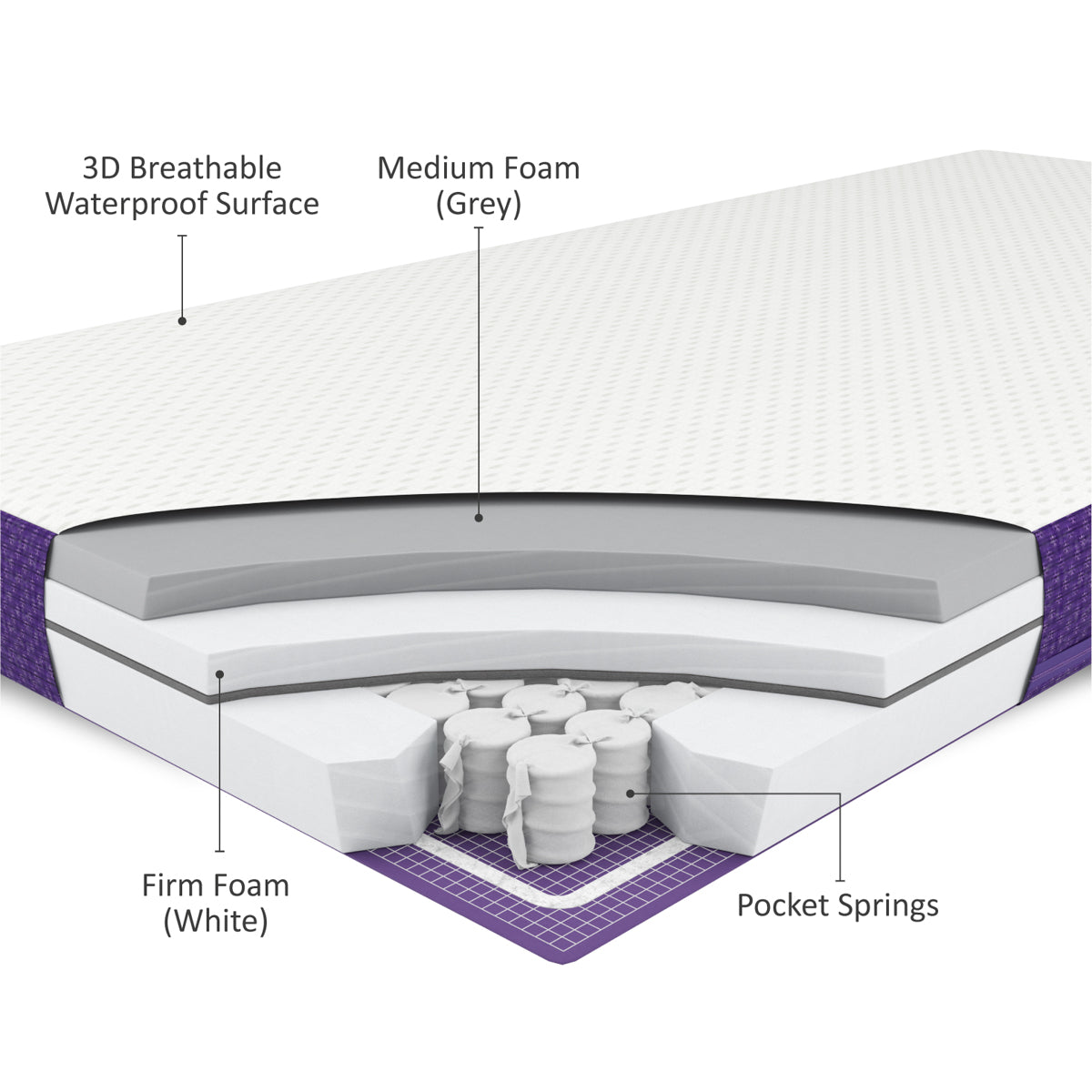 The ultimate innovation in baby & child mattresses, the SnuzSurface Pro cot and cot bed mattress boasts a 3D breathable mesh cover with a waterproof membrane, seeing your little one through the potty training years, all the way to their 7th Birthday. The Pro mattress features a unique triple-core design, allowing you to change the level of firmness as your child grows and develops. Adaptive and durable, the Pro mattress provides baby with the best support as they sleep.