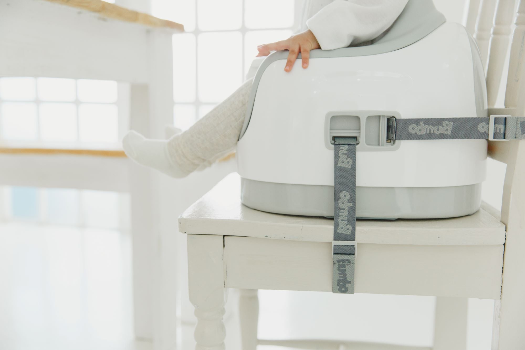 The buckles of the attachment straps can be neatly stowed away in its slots on either side of the Bumbo® multi seat.