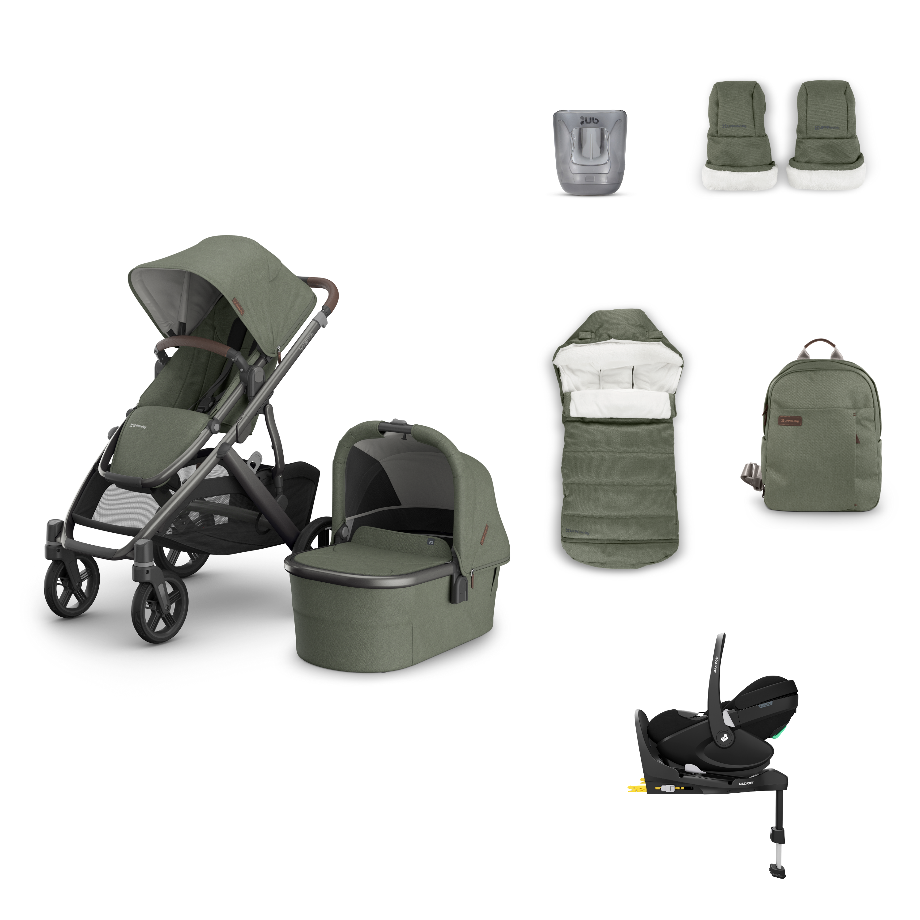 Uppababy Vista V3 Pram, Accessory and Travel System Bundle with Maxi Cosi Pebble 360 Pro V2 and FamilyFix 360 Pro Base - Evelyn