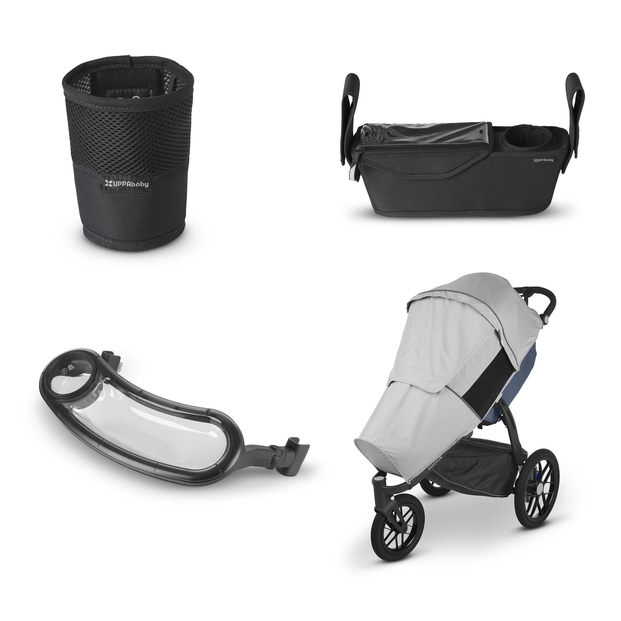 The Uppababy Ridge Explorer Pack is a set of 4 accessories that ensures your Ridge stroller is fully equipped for all-day stools and family adventures. The pack includes a parent console, snack tray, cup holder, and sun/bug shield.