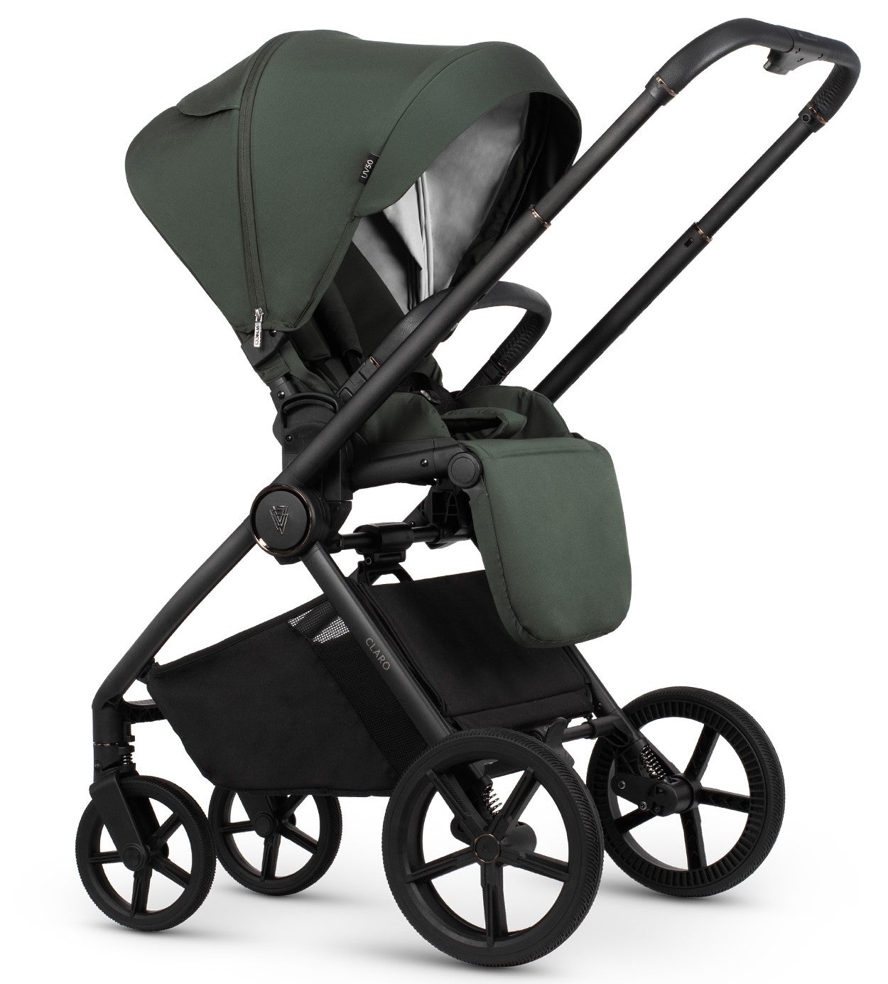 The Venicci Claro embodies modern city style, combining functionality with striking design. Its stylish black-matte coated aluminum chassis, accented with gloss copper detailing and leatherette handles, exudes quality and luxurious craftsmanship. High-quality, soft fabrics in intriguing colors, embossed patterns, and elegant metal hardware complete its sophisticated look. Each Claro set also includes matching accessories such as a changing bag and footmuff, ensuring both style and convenience.