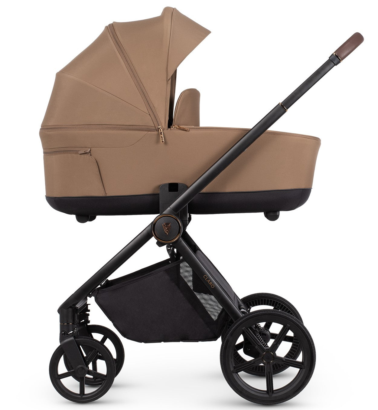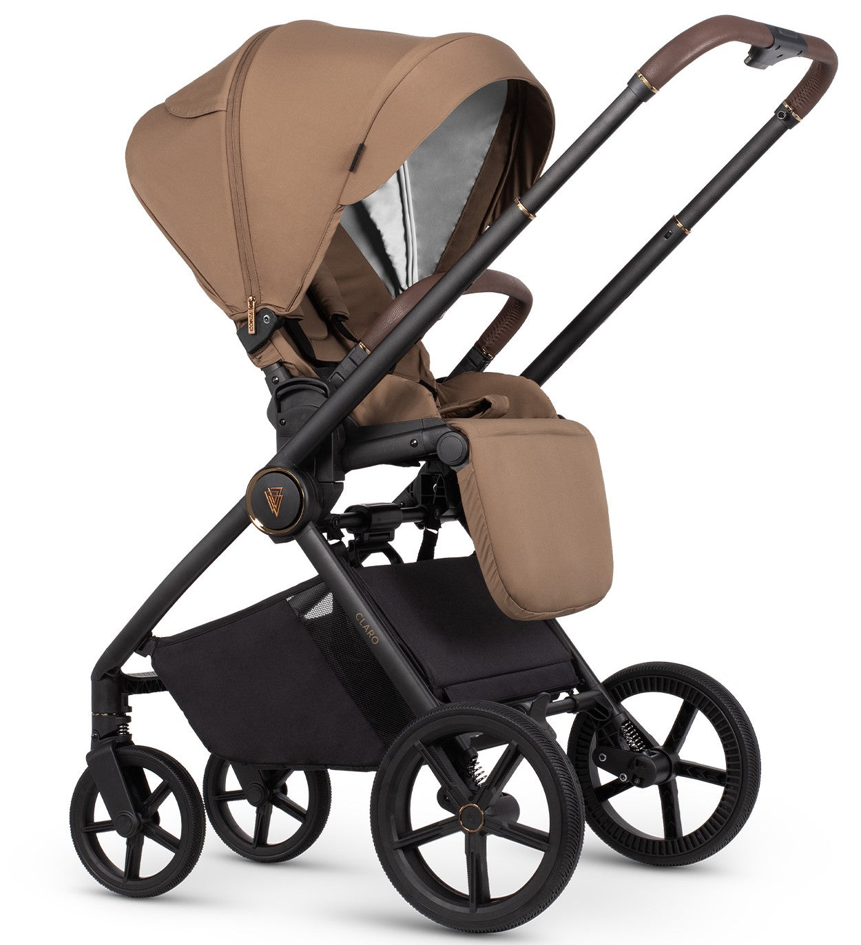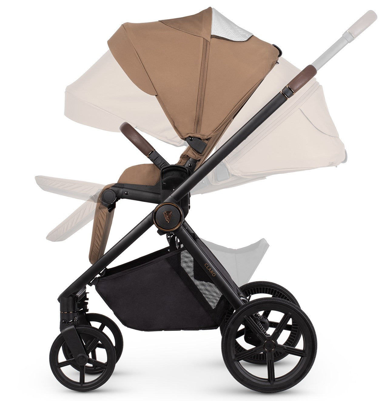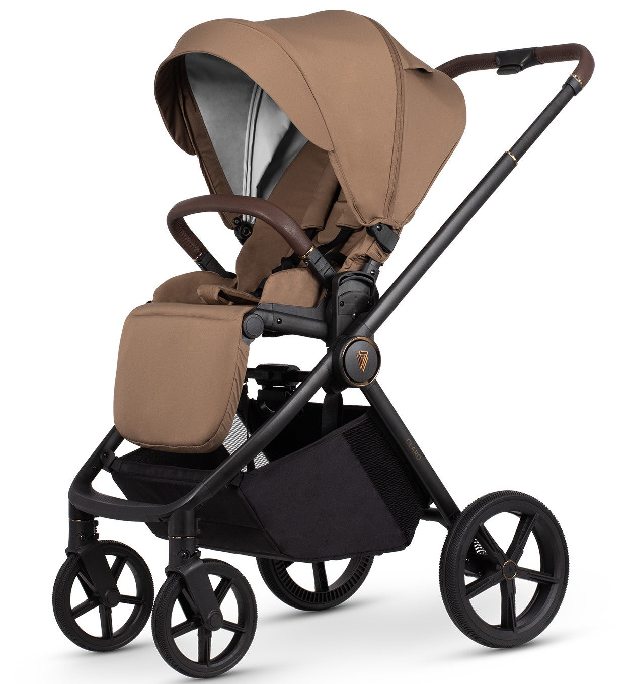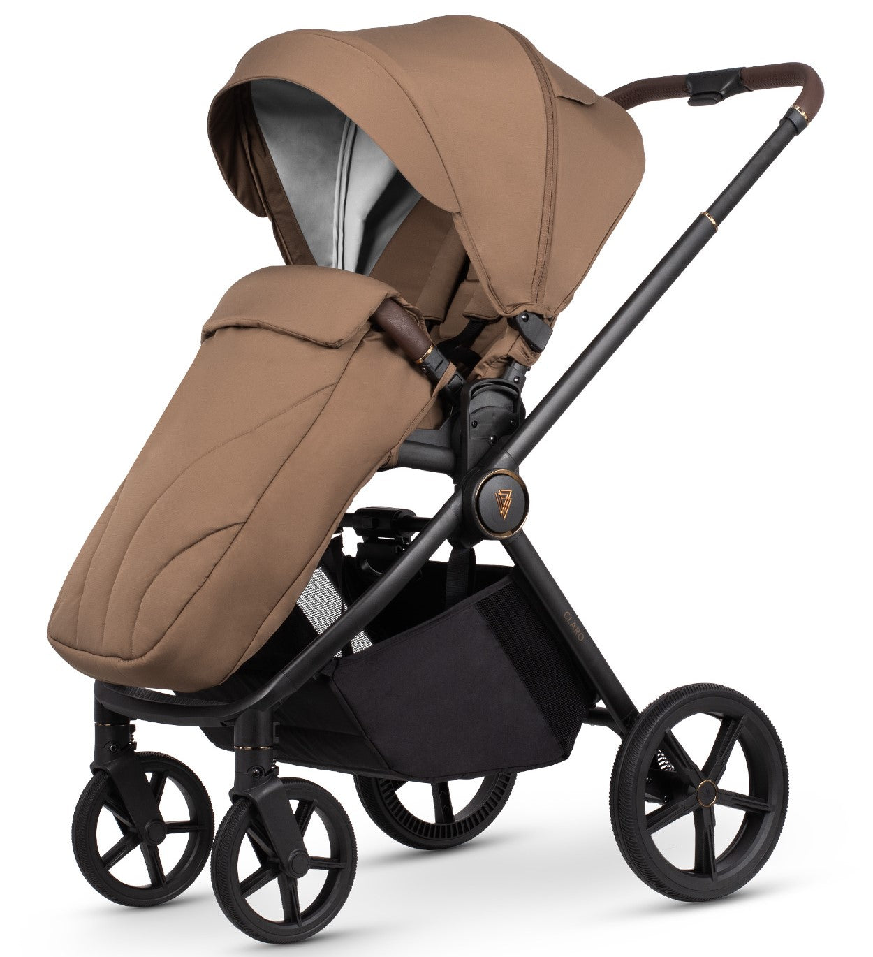 The Venicci Claro embodies modern city style, combining functionality with striking design. Its stylish black-matte coated aluminum chassis, accented with gloss copper detailing and leatherette handles, exudes quality and luxurious craftsmanship. High-quality, soft fabrics in intriguing colors, embossed patterns, and elegant metal hardware complete its sophisticated look. Each Claro set also includes matching accessories such as a changing bag and footmuff, ensuring both style and convenience.