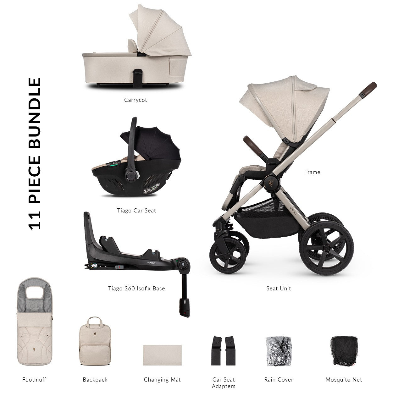 Venicci Upline 2 Complete Pram, Accessory and Travel System Bundle - Stone Beige