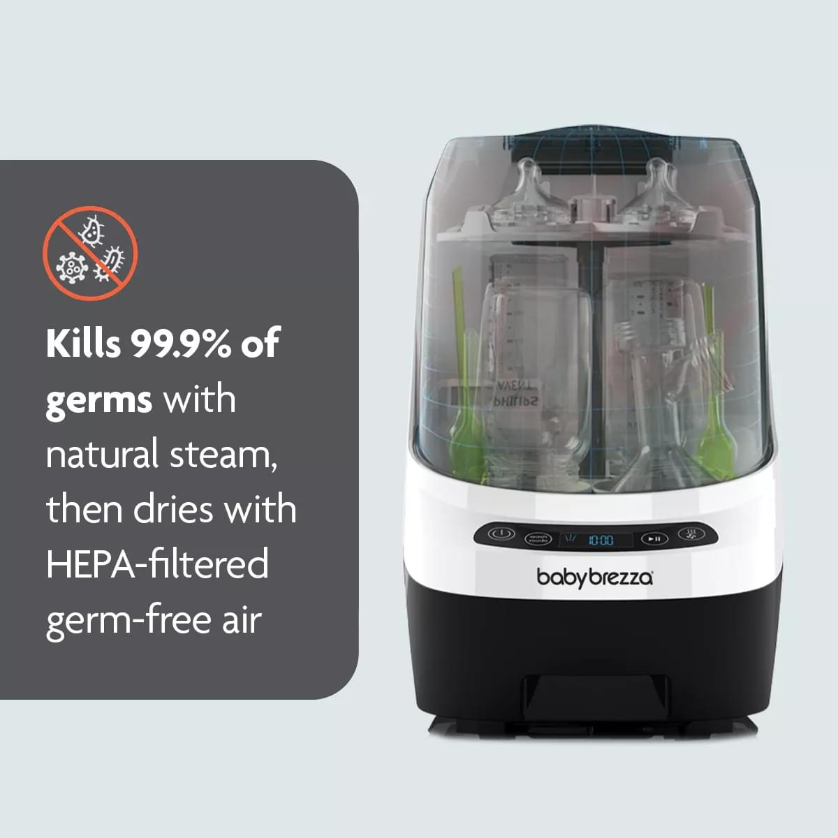 Experience the future of bottle cleaning with the Baby Brezza Bottle Washer Pro. The first appliance to automatically wash, sterilise and dry bottles and accessories all-in-one go. Powerfully eliminating milk residue with its 20 high-pressure spray jets, this machine ensures all the surfaces of bottles, breast pump parts and accessories are cleaned. Also utilising natural steam to kill 99.9% of germs, then drying completely with germ-free, HEPA-filtered hot air.