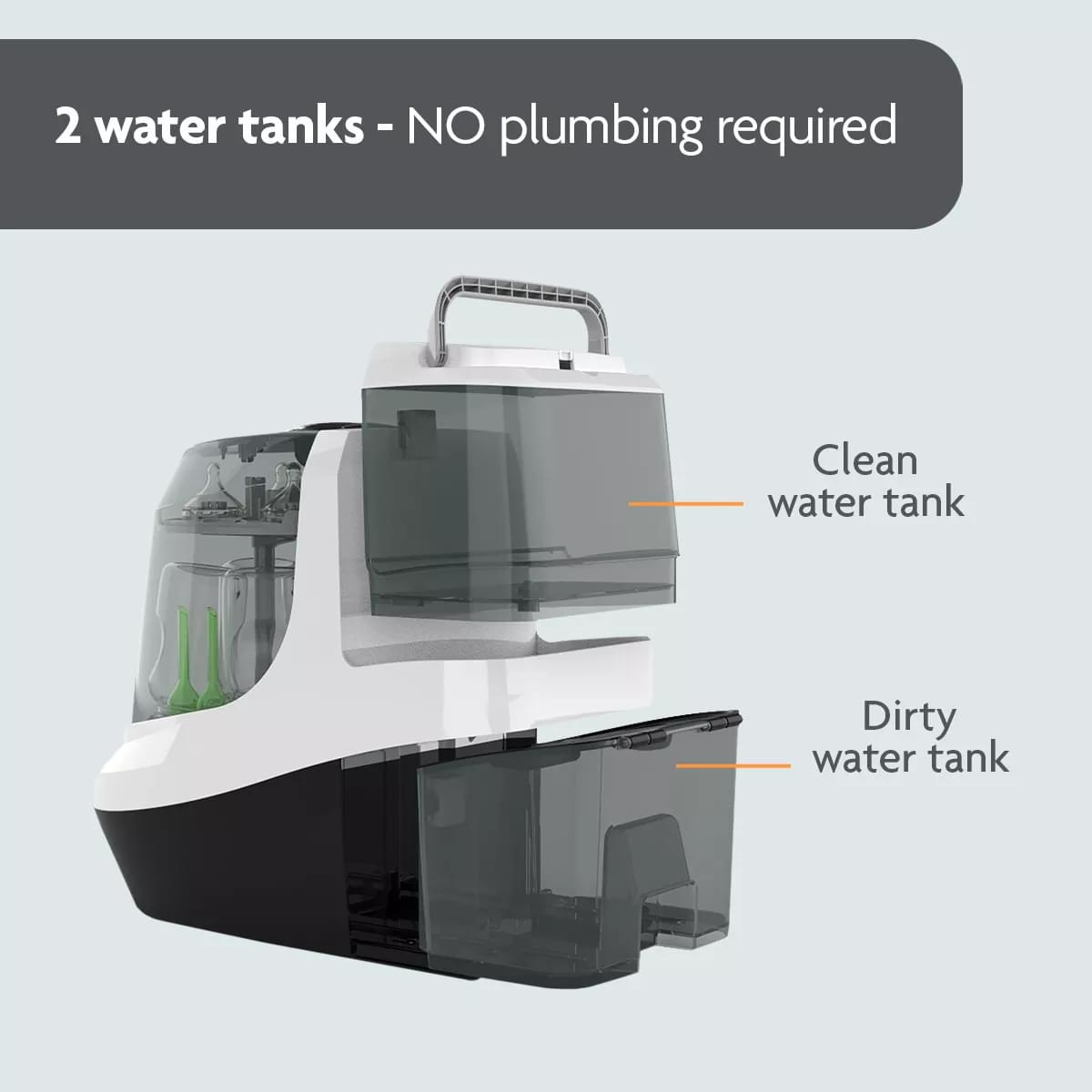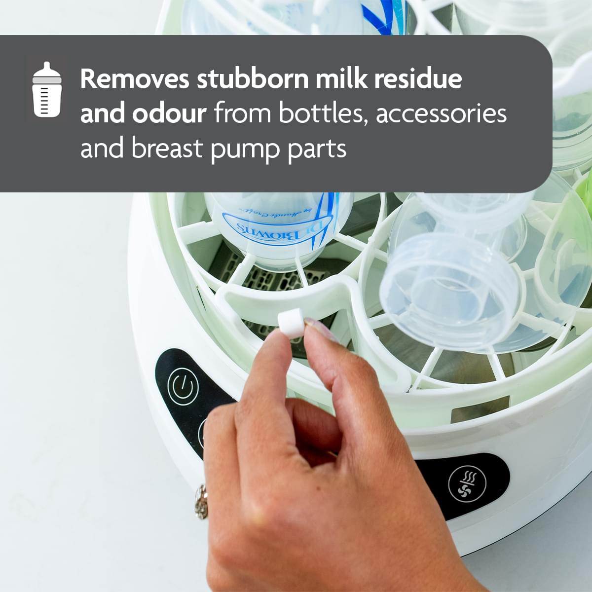 - Effortlessly washes, sterilises, and dries bottles, breast pump parts, and sippy cups, eliminating the need for a bottle brush