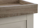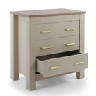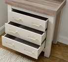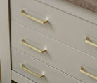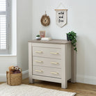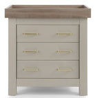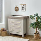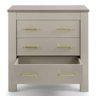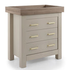 The Bordeaux Oatmeal dresser with a removable baby changer includes three spacious drawers and is elegantly accented with brushed gold handles, adding a touch of subtle luxury to this timeless collection