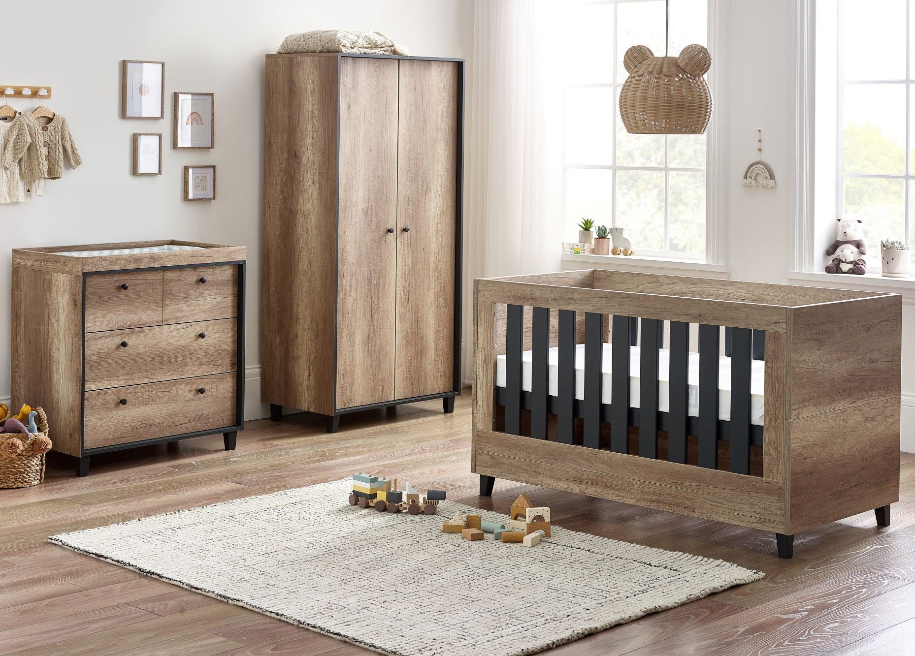 The Babystyle Montana 2 piece furniture set offers warmth and a natural feel to your baby’s nursery with its timeless oak finish and modern slate touches. Featuring a cotbed which grows with your child and a dresser with baby changer, designed to last through the years.