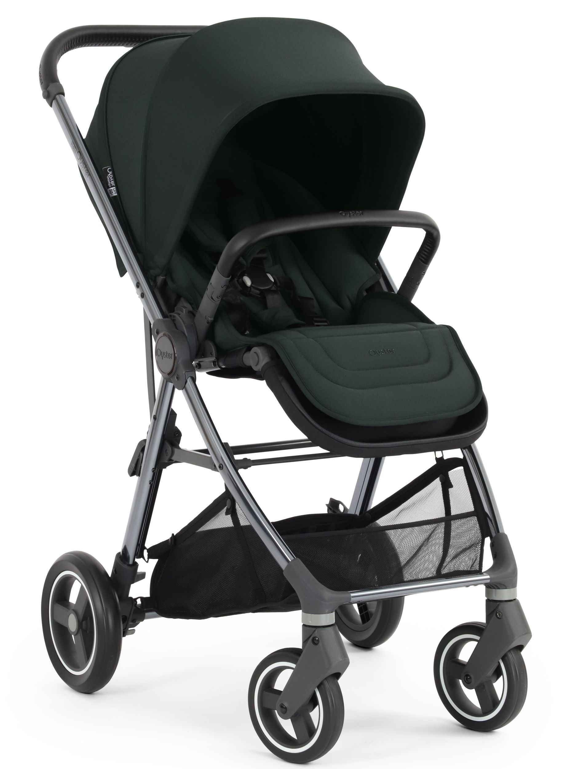 Stroller includes: chassis with wheels, complete seat unit, bumper bar and rain cover. Suitable from birth to 22kg. Compatible with the Oyster Carrycot.