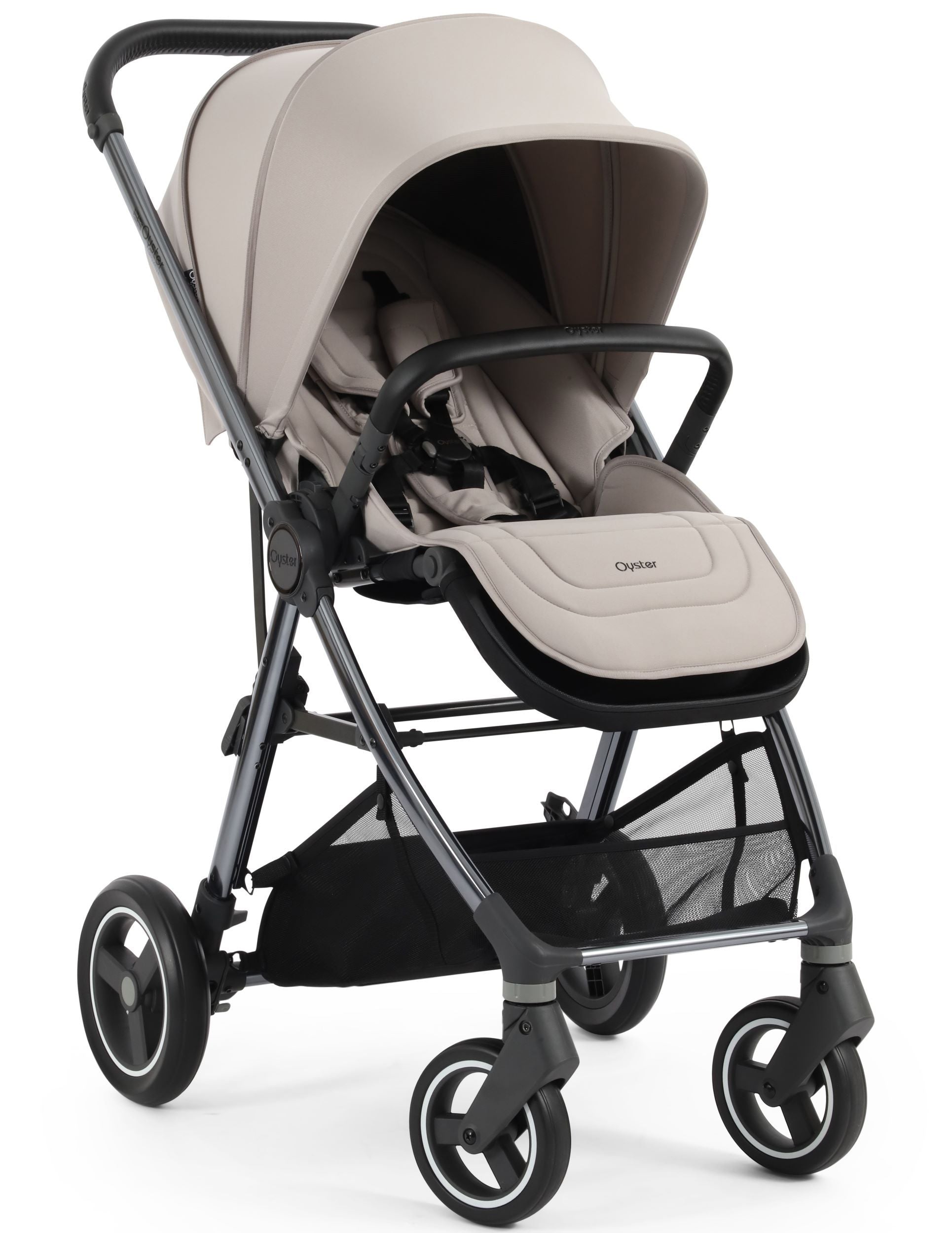 Stroller includes: chassis with wheels, complete seat unit, bumper bar and rain cover. Suitable from birth to 22kg. Compatible with the Oyster Carrycot.