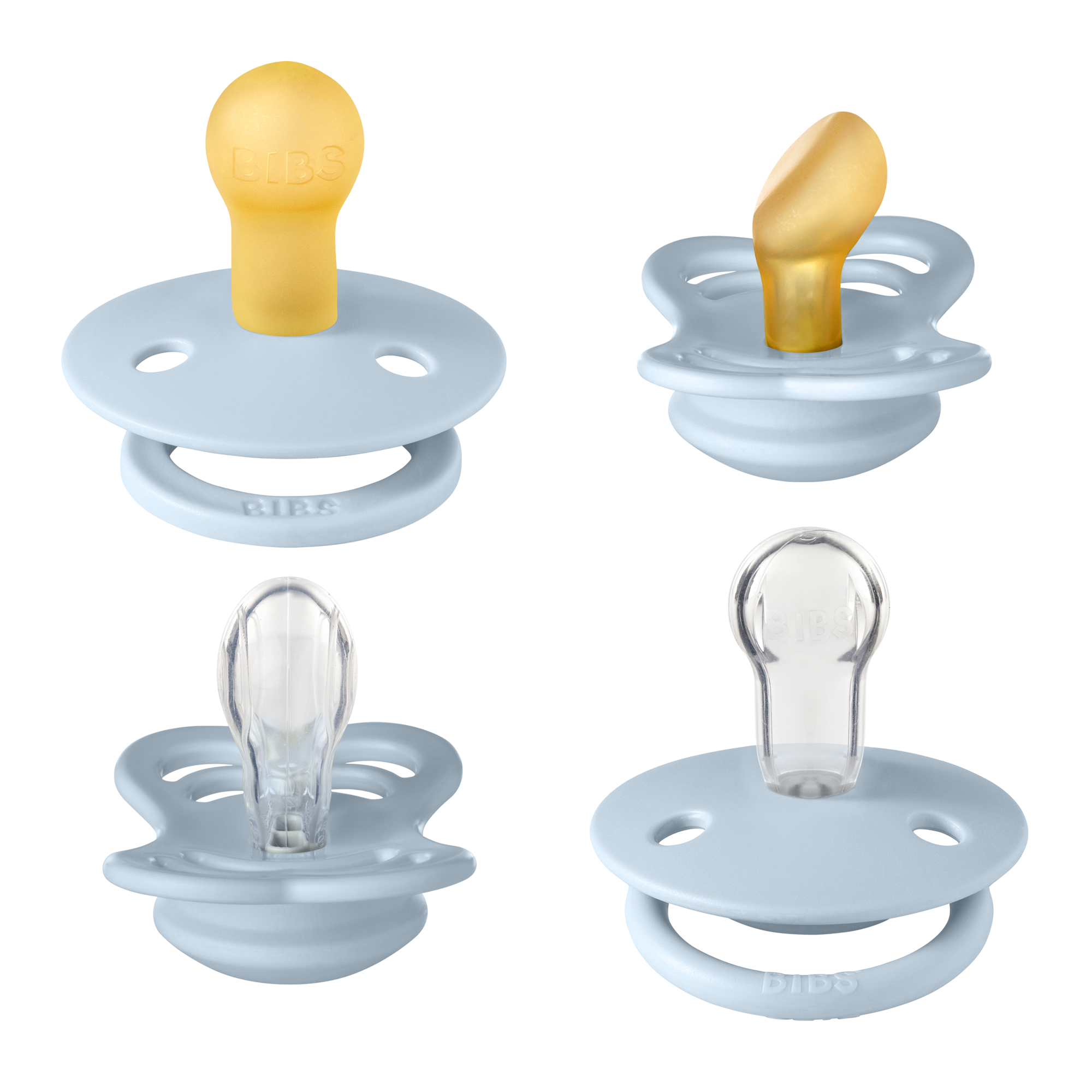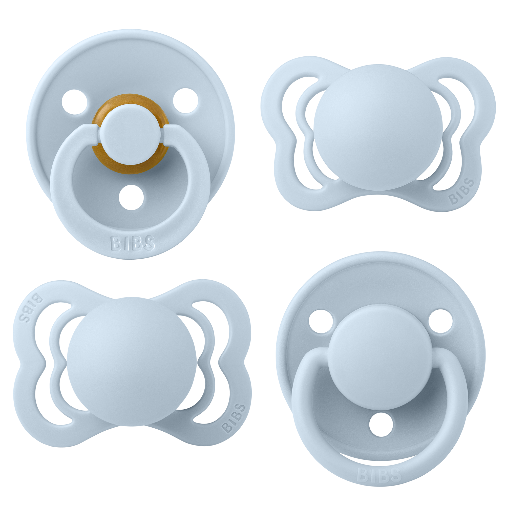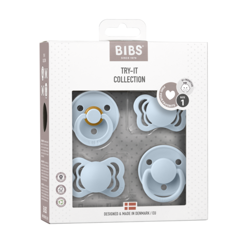 It's important to try out different shapes and sizes to find the perfect fit for your baby. Therefore, BIBS have launched the BIBS Try-it Collection. In the collection, you get a pacifier from their 4 different categories with a selection of all their nipple types (round, symmetrical and anatomical) and materials (natural rubber latex and silicone).