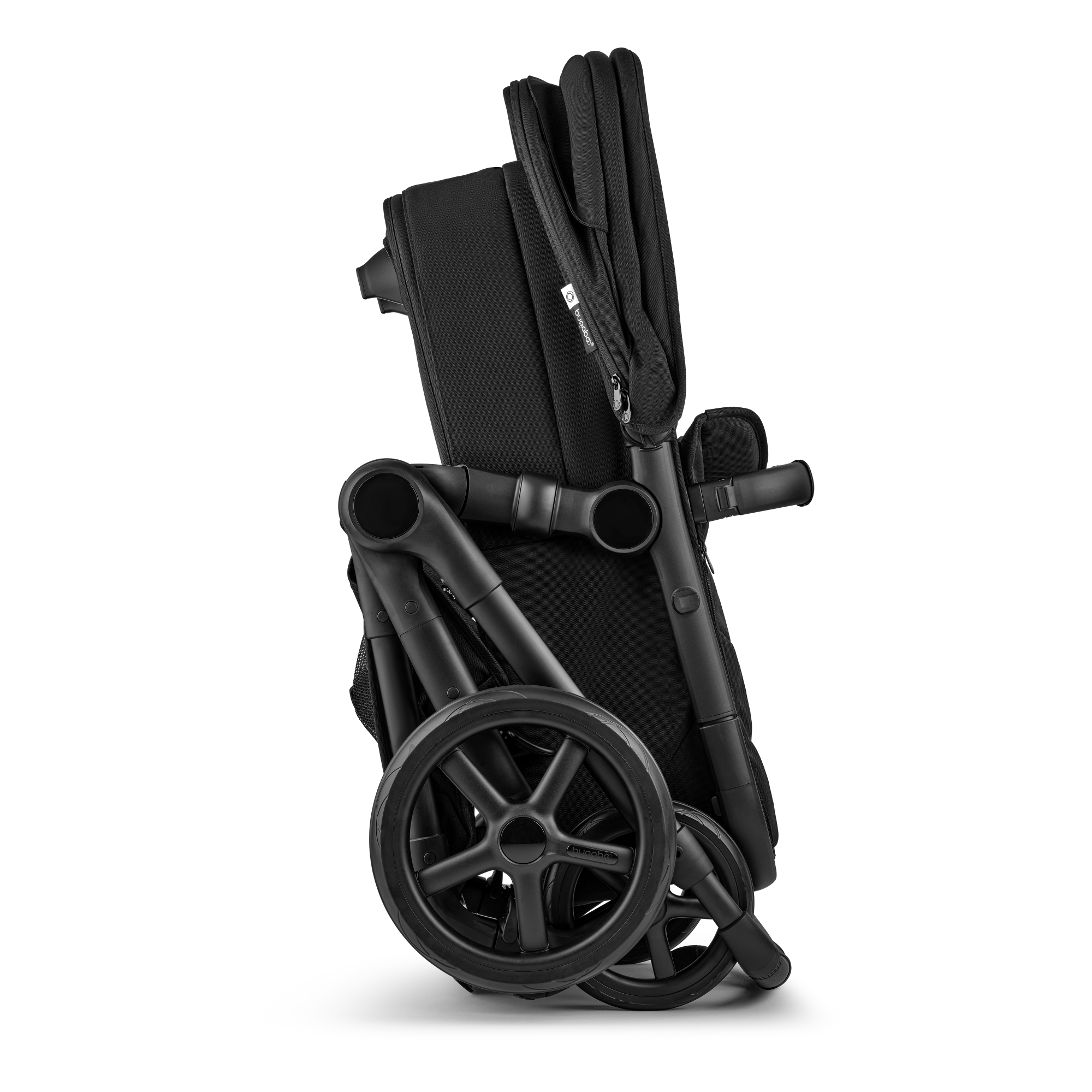 - Seat: Reversible and reclinable seat. Includes the seat/carrycot frame, seat fabric, seat hardware, five-point safety harness, adjustable seat footrest, and rotating carry handle.