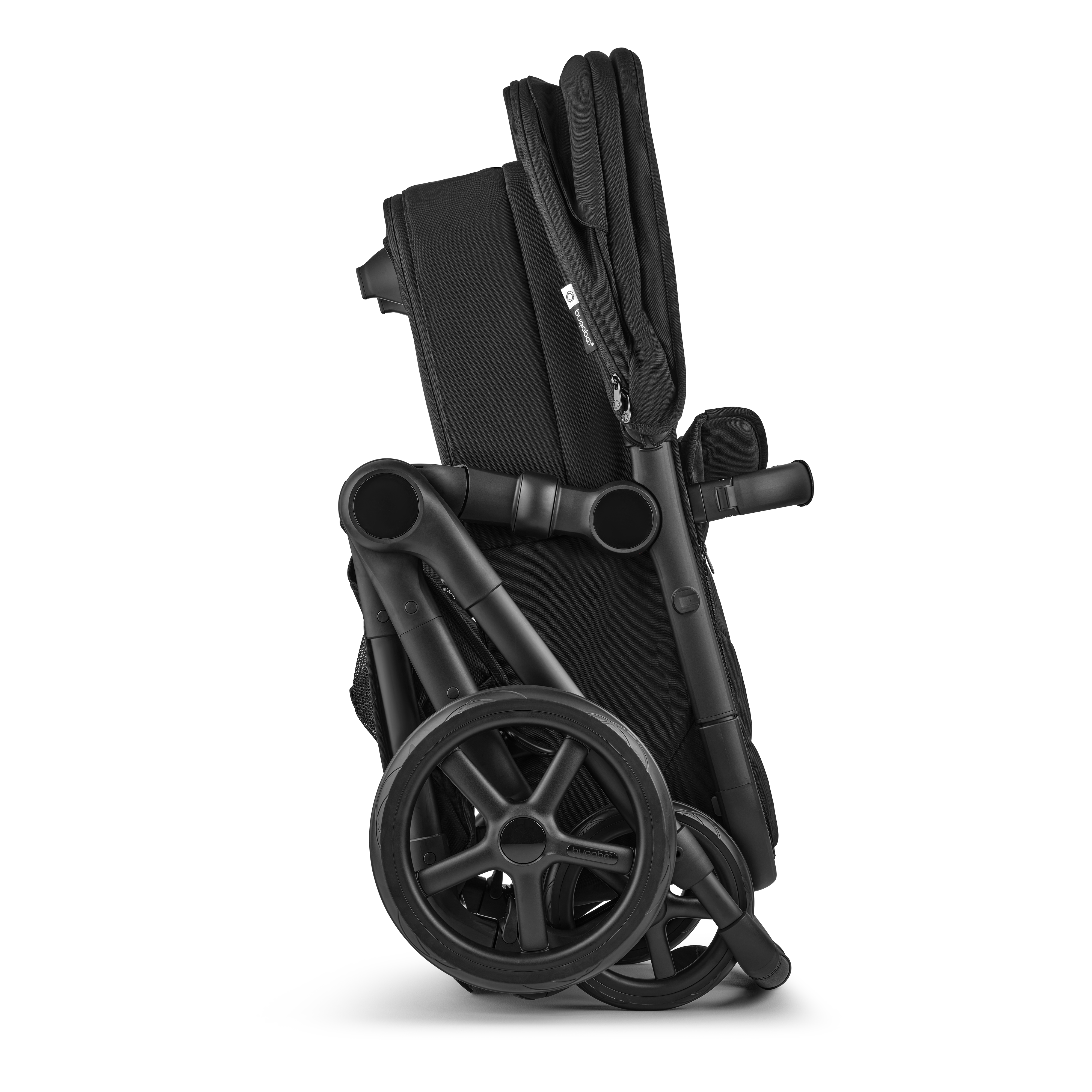 - Seat: Reversible and reclinable seat. Includes the seat/carrycot frame, seat fabric, seat hardware, five-point safety harness, adjustable seat footrest, and rotating carry handle.