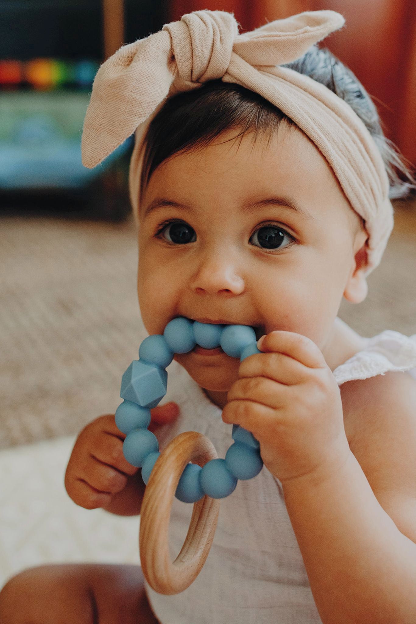Presenting the Moon Teether by Jellystone Designs, the perfect combination of nature and innovation to soothe your teething baby. This award-winning teether combines the benefits of a beech wood teething ring with a textured silicone ring, providing the best of both worlds for your little one's sore gums.