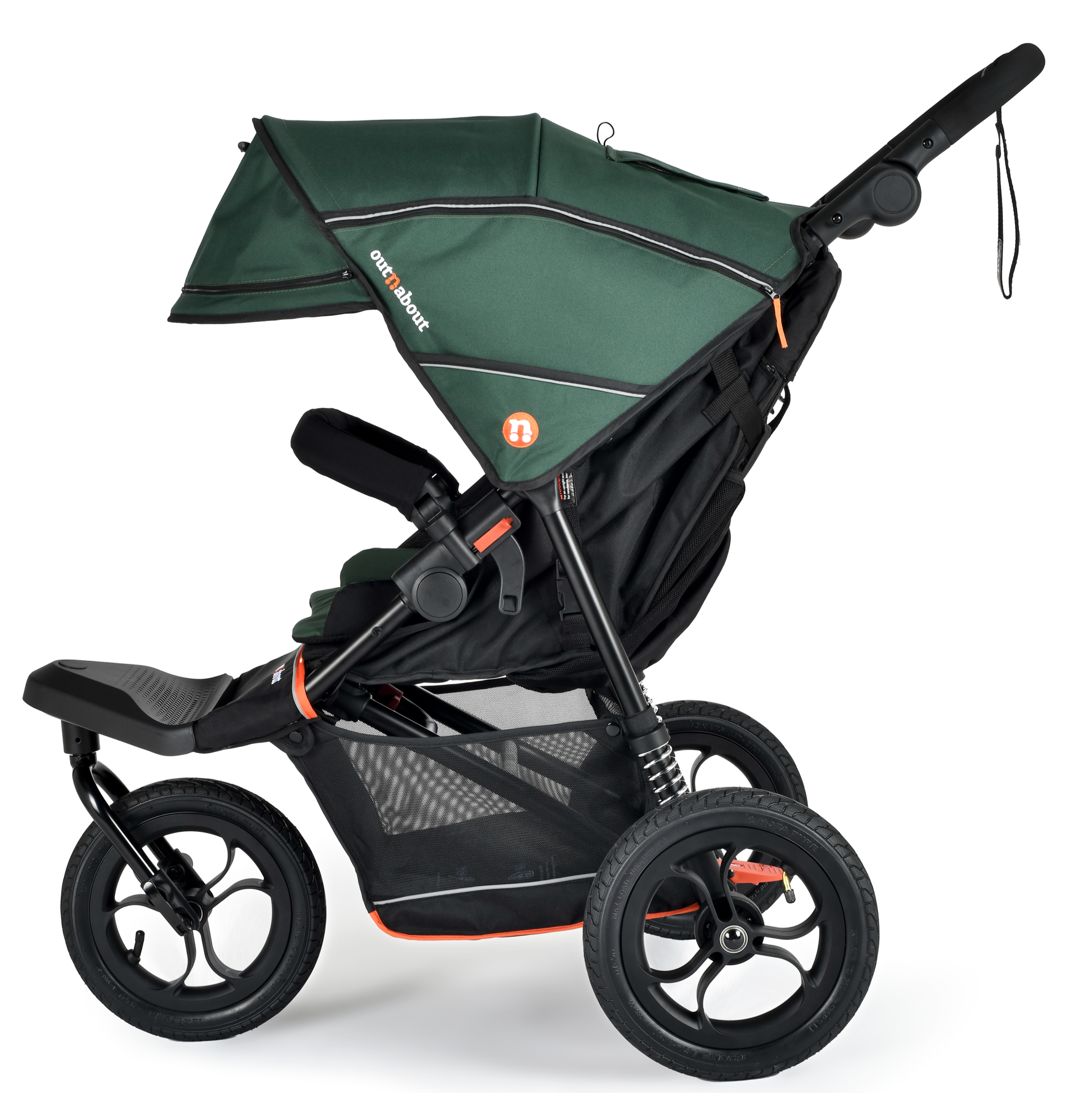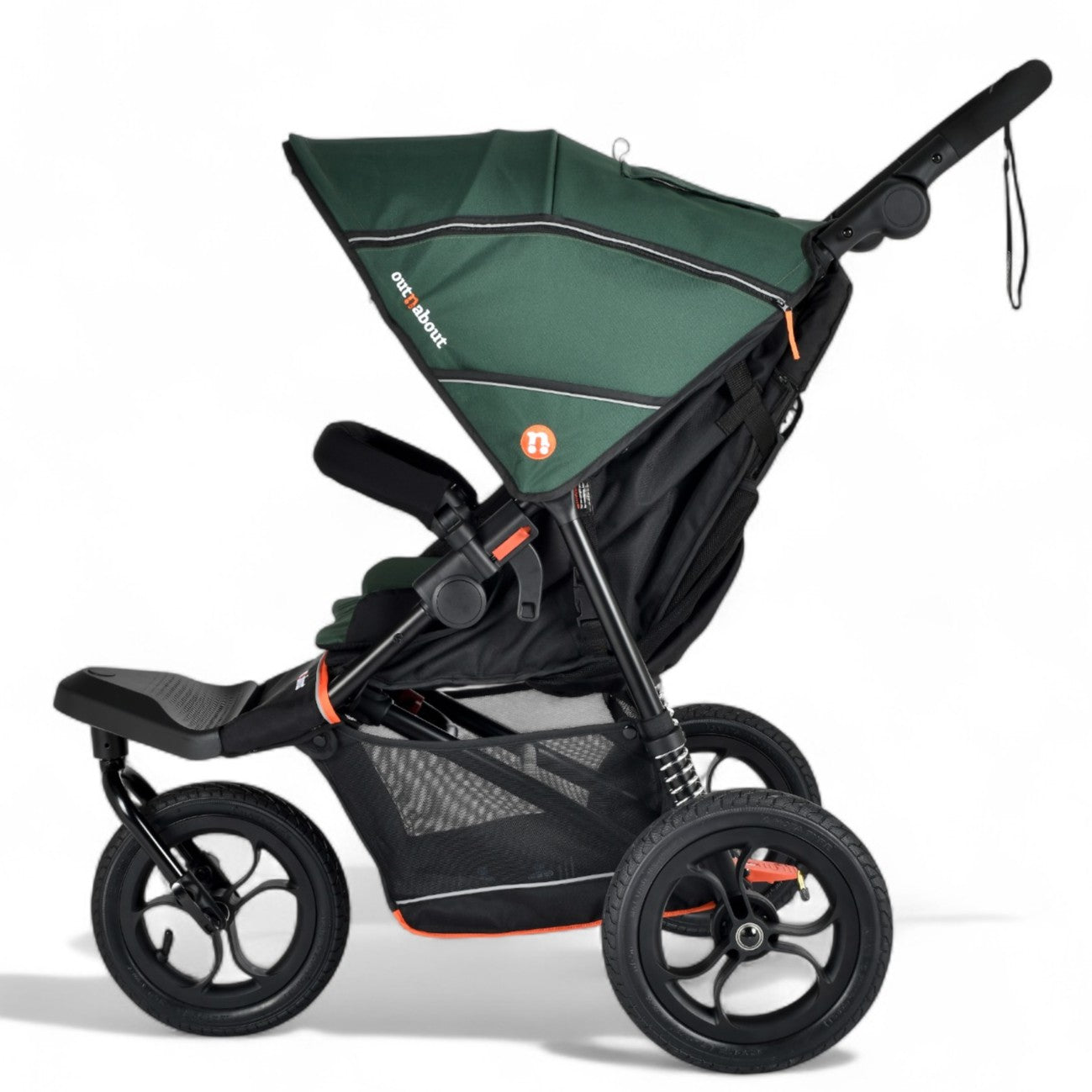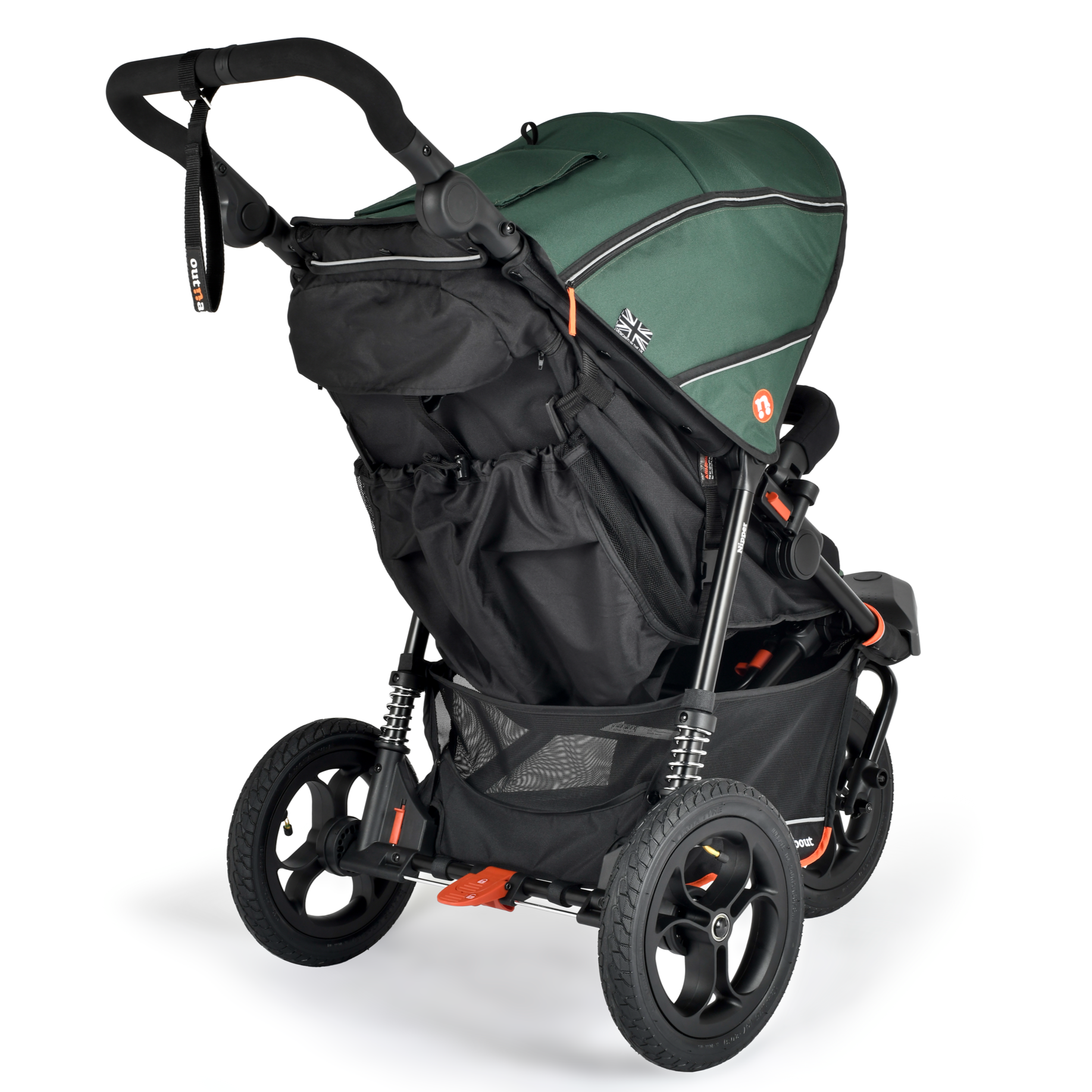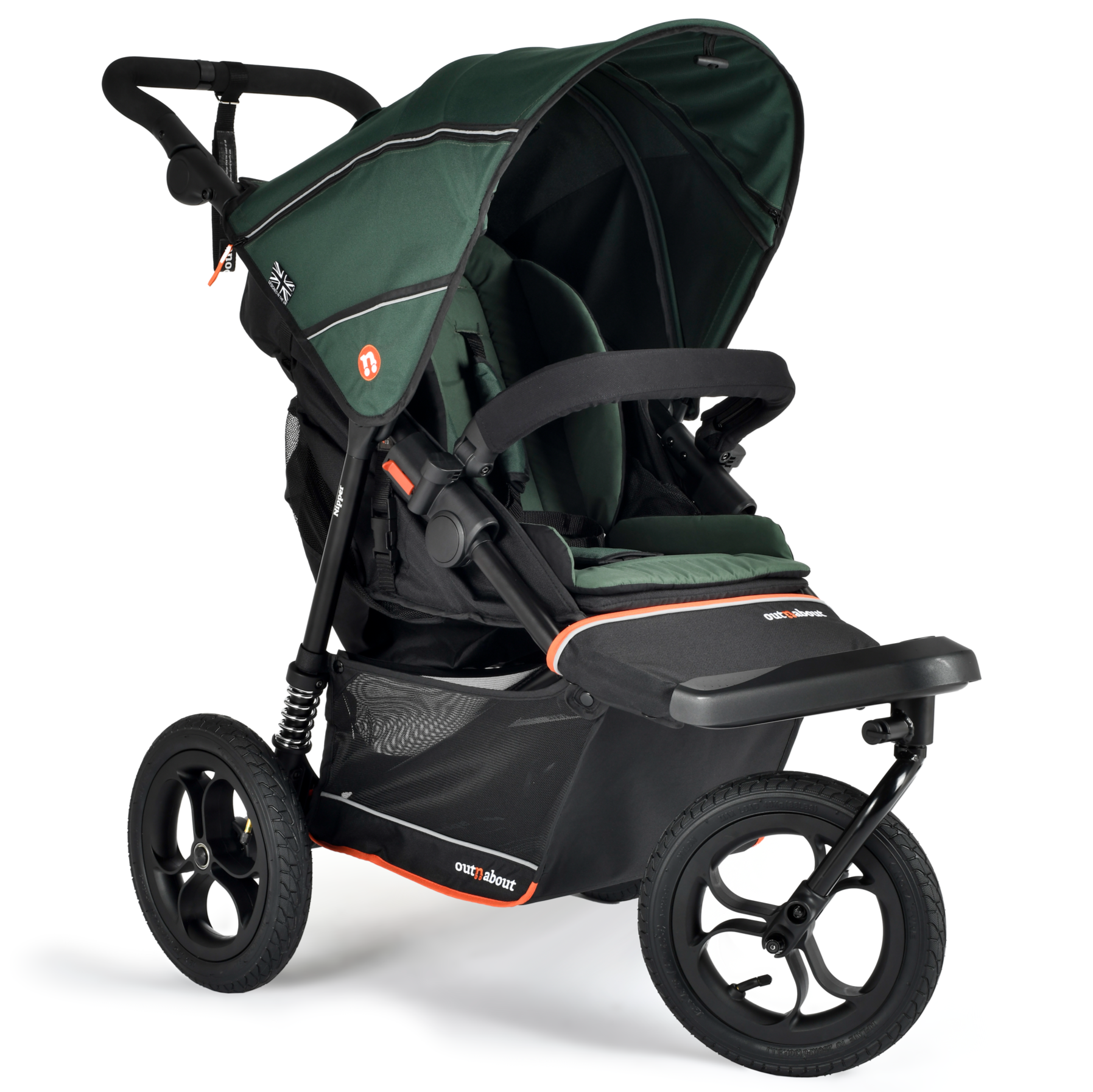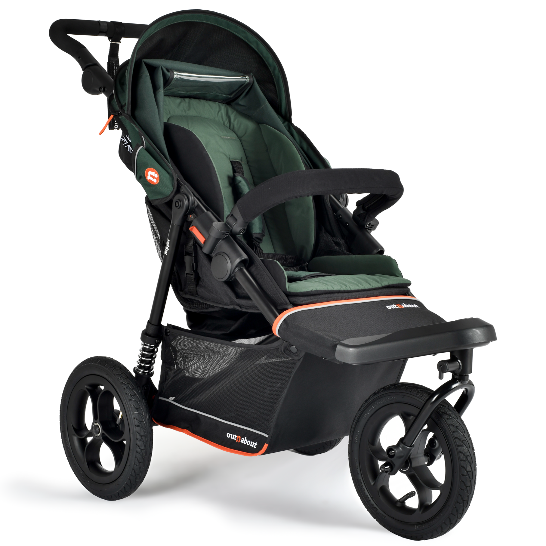 The Nipper V6 pushchair is the most versatile and feature-rich buggy Out’n’About has ever made, built to go places other buggies simply can’t. This all-terrain 3-wheel pushchair is lightweight, easy to handle, and ready for real family life from newborn to around 4 years old. It features 12” air-filled tyres, a swivel-lock front wheel for stability on rough ground, and a compact design just as suited to shops and school runs as it is to off-road tracks.
