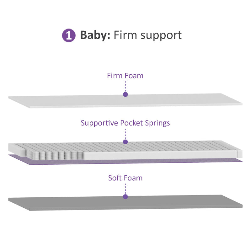 - Stage 1: Baby (0-12m), firm as recommended by safe sleep experts